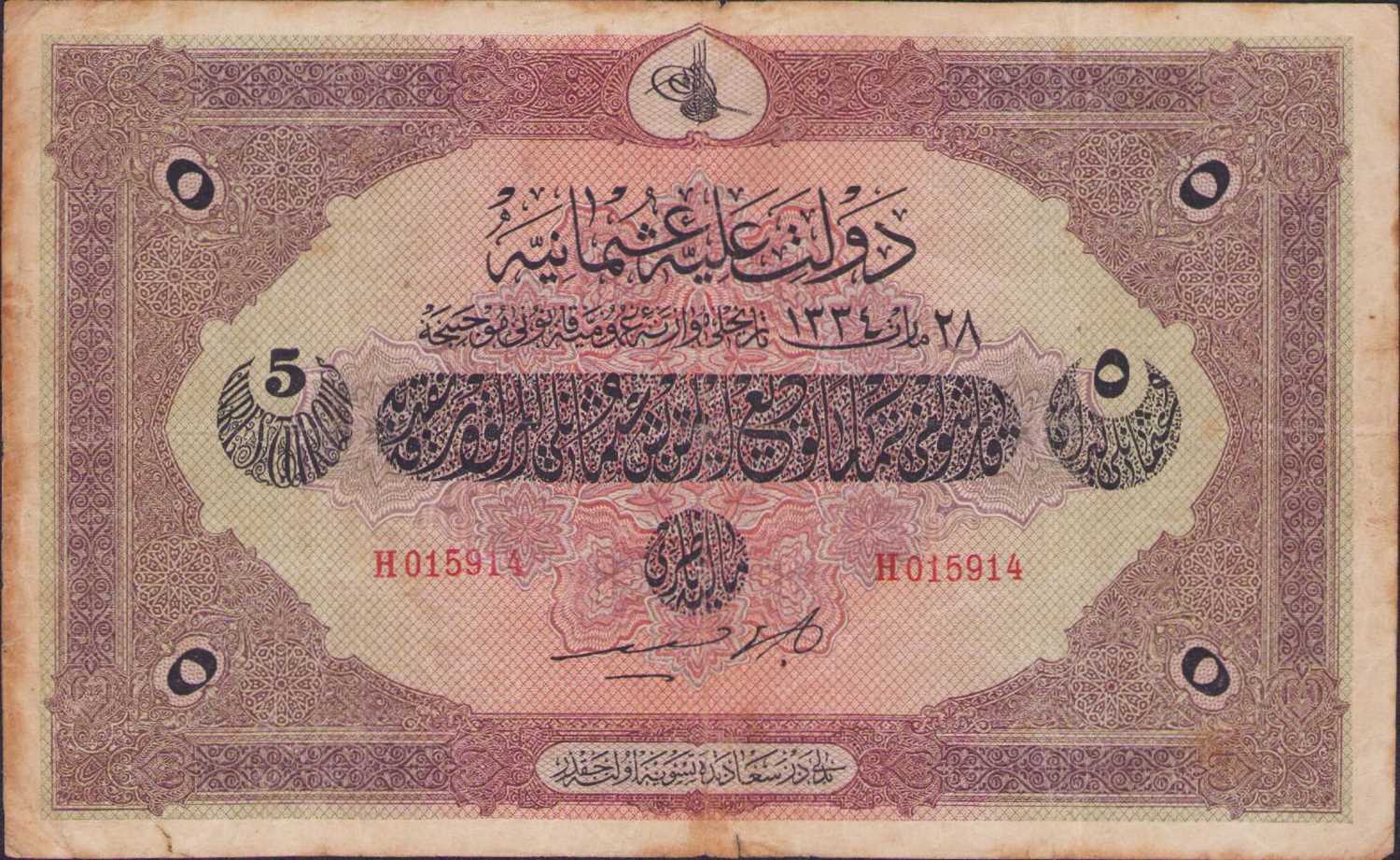 1334 SULTAN VAHİDEDDİN 5 LİRA SERİ H ÇT