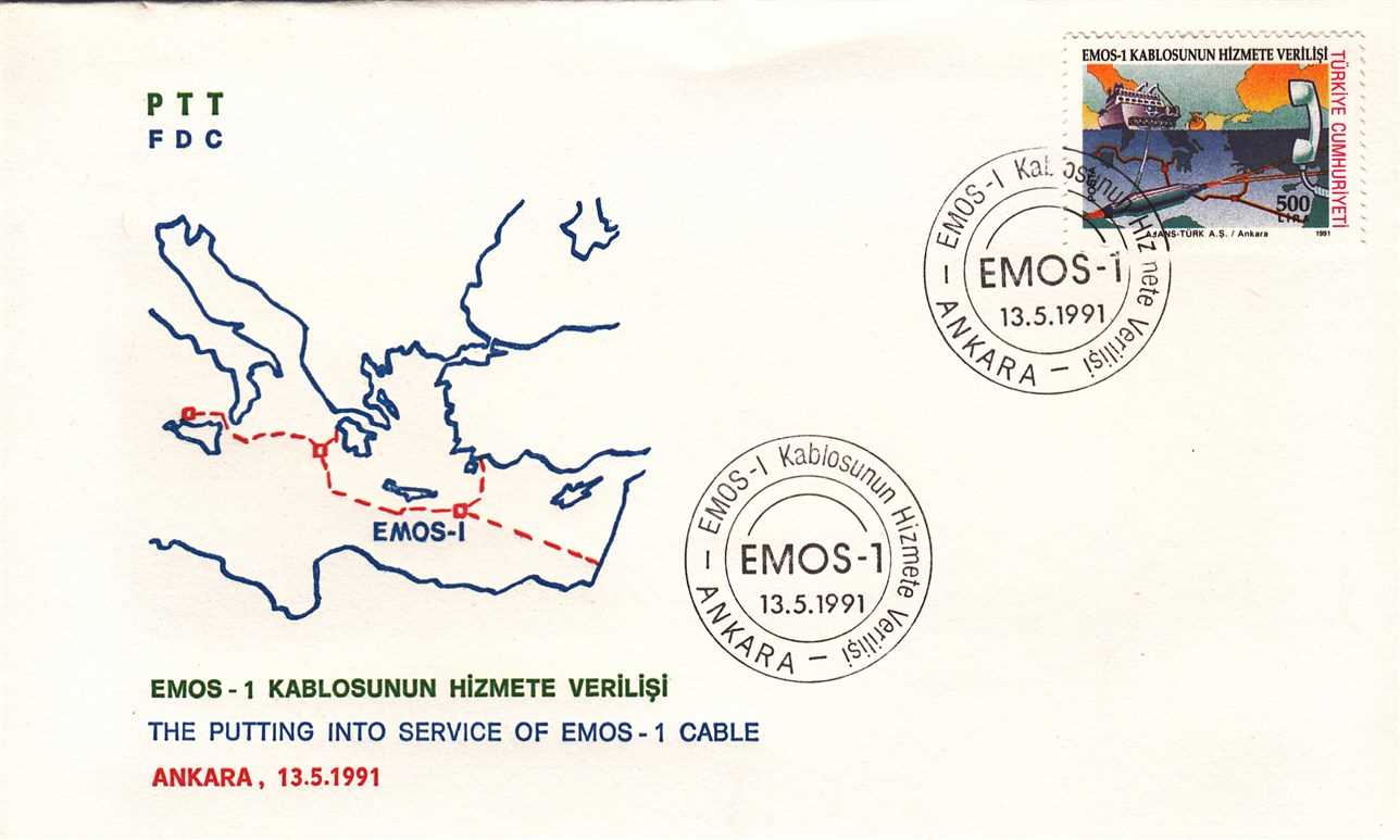 1991 EMOS-I KABLOSUNUN HİZMETE VERİLİŞİ KONULU SÜREKLİ SERİ FDC-439 KATALOG: 20 TL