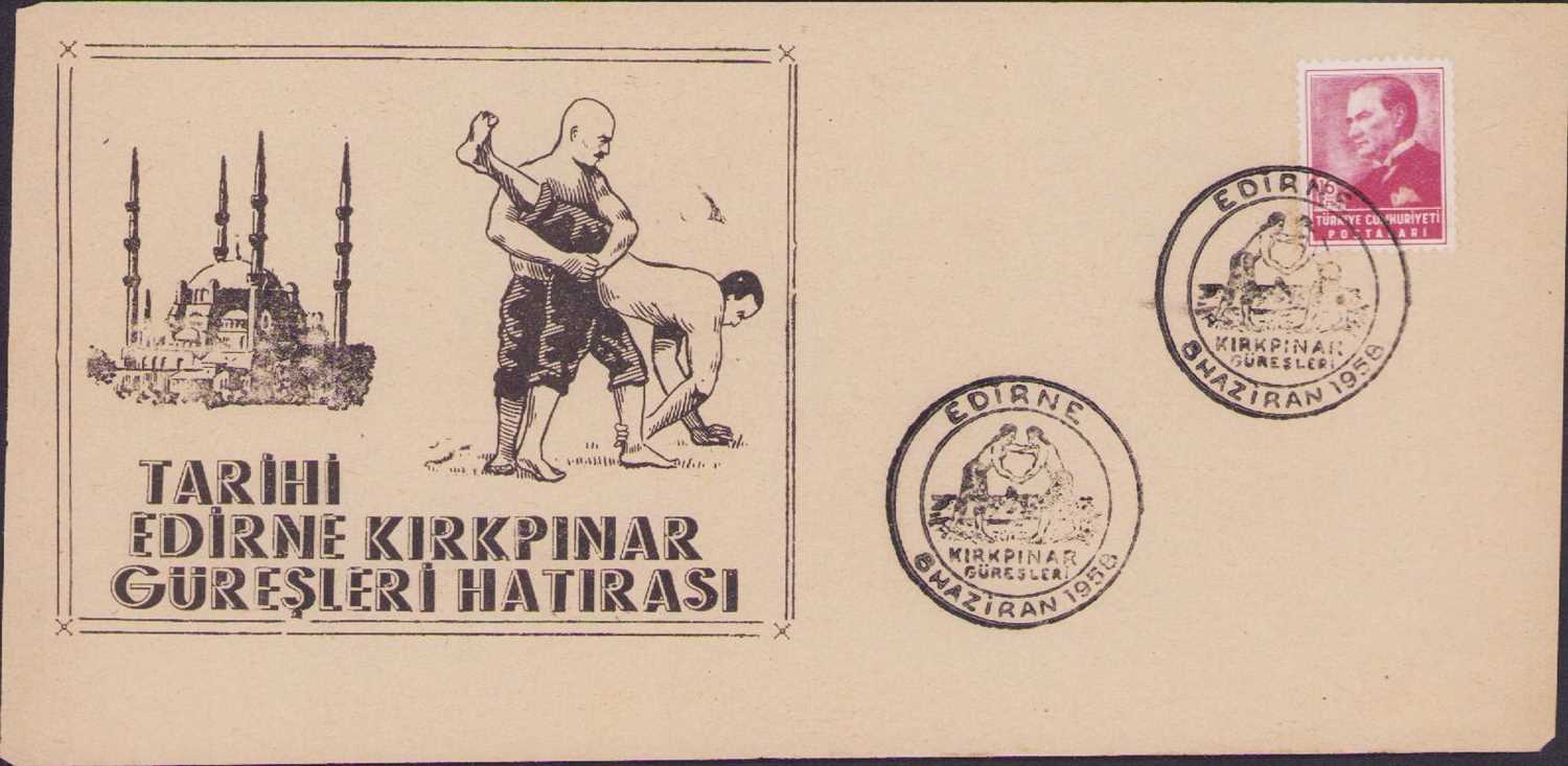8 HAZİRAN 1958 EDİRNE KIRKPINAR GÜREŞLERİ DAMGALI PULLU FİLATELİK KAĞIT
