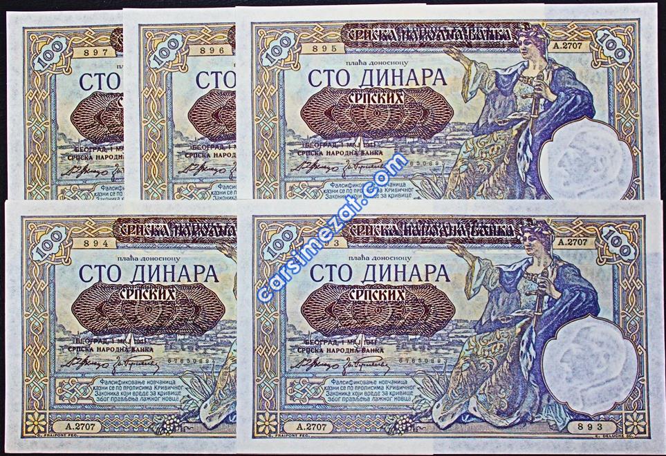 YABANCI KAĞIT SIRBİSTAN 100 DİNAR 1941 SERİ TAKİPLİ 5 Lİ LOT ÇİL