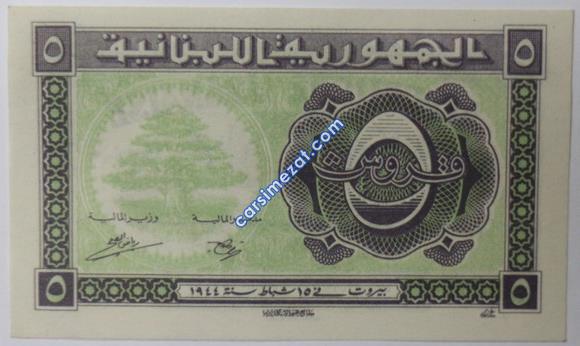 YABANCI KAĞIT LÜBNAN 5 PIASTRES 1944 ÇİL