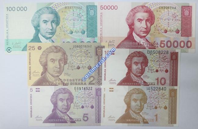 YABANCI KAĞIT SET HIRVATİSTAN 1/5/10/25/50.000/100.000 DİNAR 1991 ÇİL