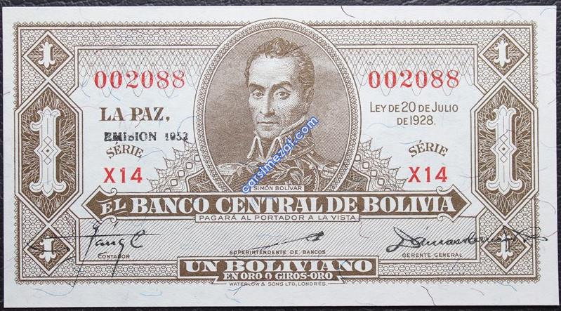 YABANCI KAĞIT BOLİVYA 1 BOLIVIANO 1928 ÜZERİ 1953 SÜRSARJ ÇİL