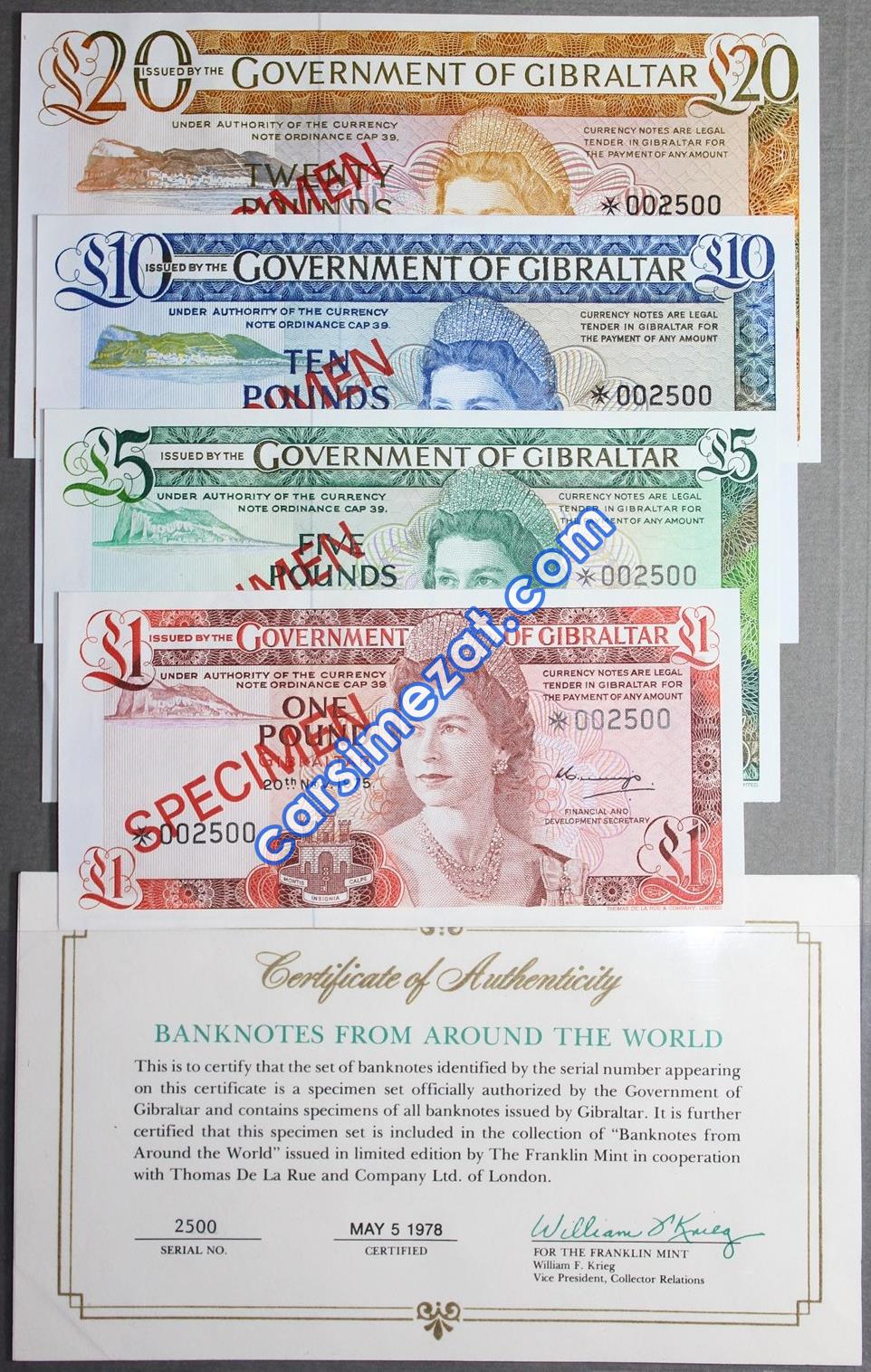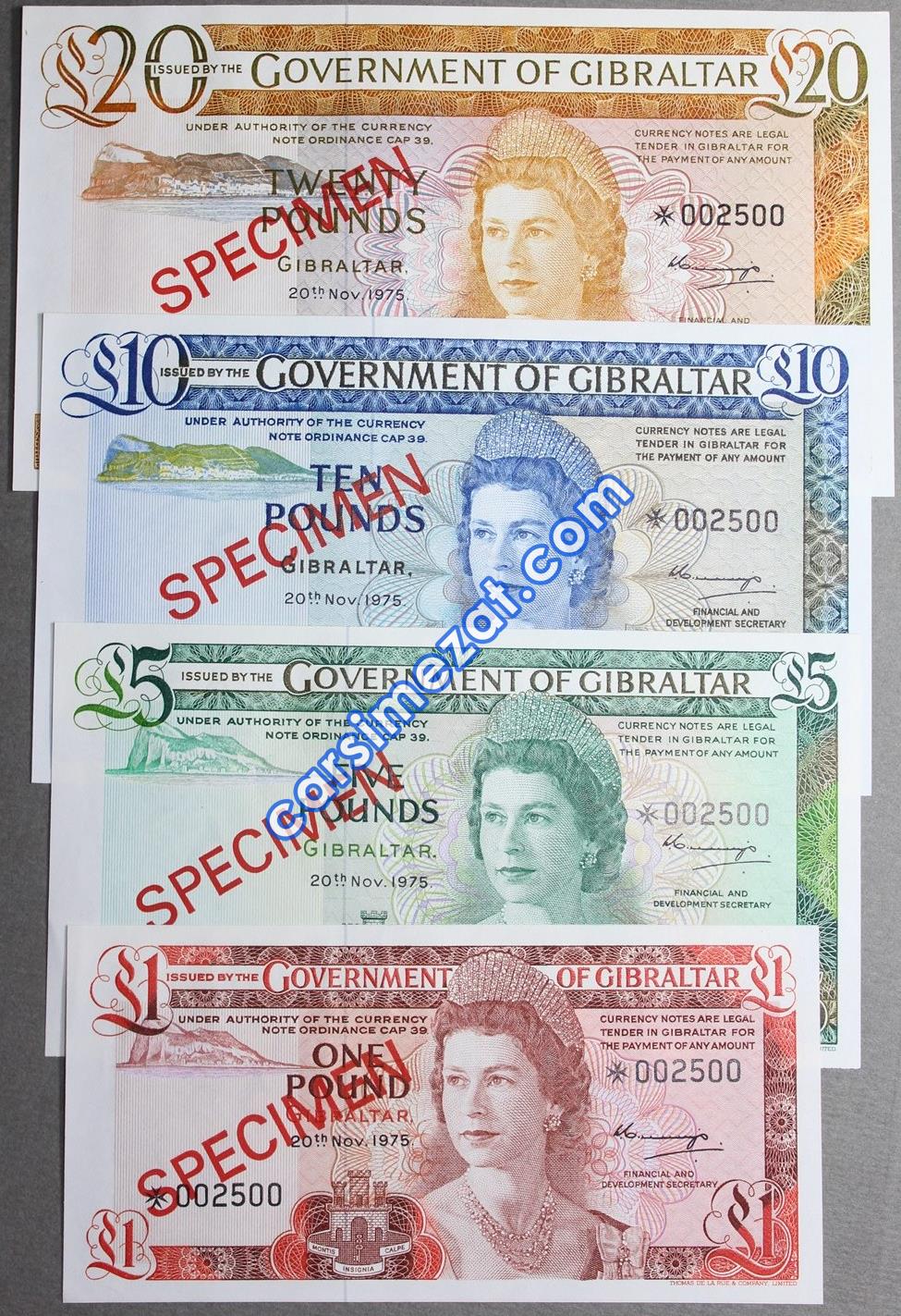 YABANCI KAĞIT CEBELİTARIK 1-5-10-20 POUND 1975 SPECIMEN SERTİFİKALI AYNI NUMARA 4 LÜ LOT ÇİL