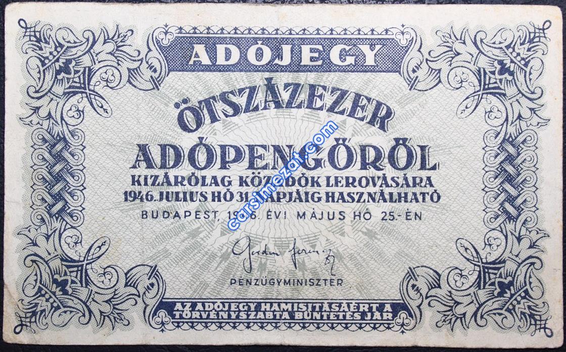 YABANCI KAĞIT MACARİSTAN 500.000 ADÖPENGÖ 1946 ÇT