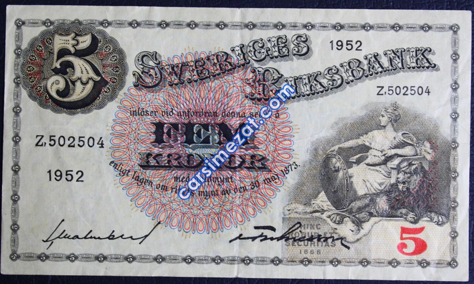 YABANCI KAĞIT İSVEÇ 5 KRONOR 1952 TEMİZ