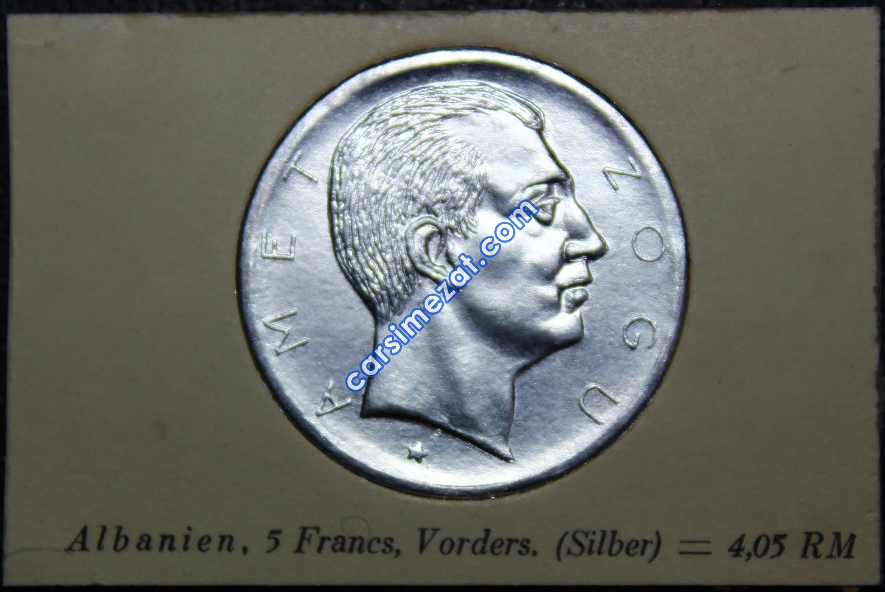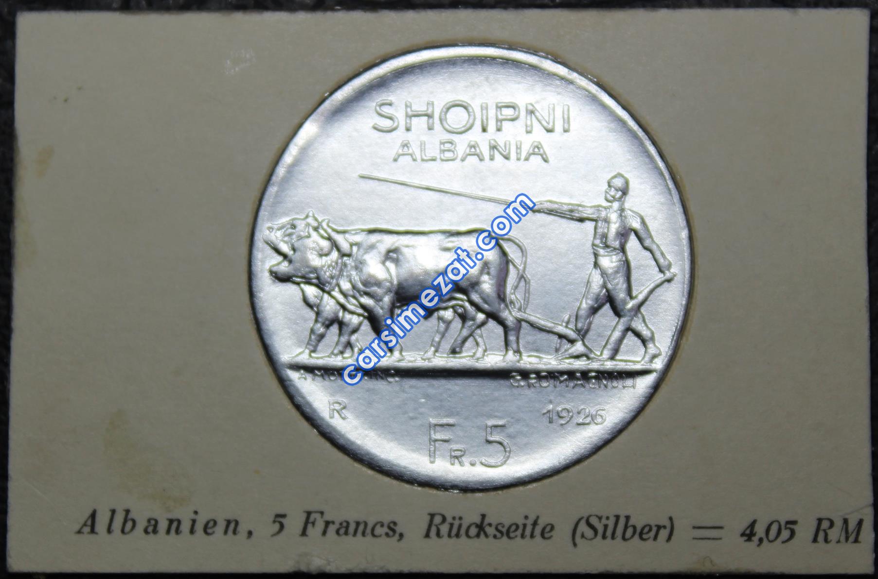YABANCI MADENİ KOLEKSİYONERLER İÇİN 20. YÜZYIL BAŞINDA HAZIRLANAN GÜMÜŞ VARAK GOFRE ARNAVUTLUK 5 FRANGA 1926 ARKALI-ÖNLÜ