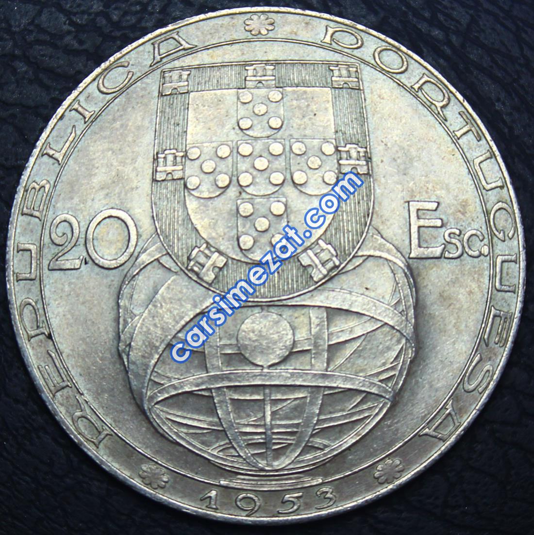 YABANCI MADENİ GÜMÜŞ PORTEKİZ 20 ESCUDO 1953 21 GRAM ÇÇT
