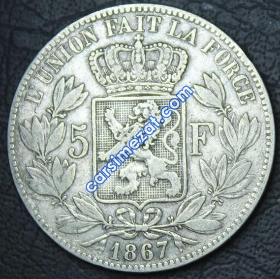 YABANCI MADENİ GÜMÜŞ BELÇİKA 5 FRANCS 1867 ÇÇT 24gr