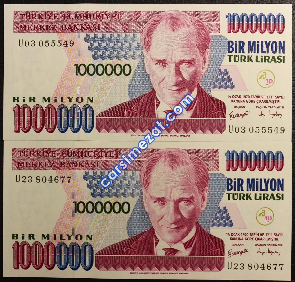 CUMHURİYET KAĞIT 7. EMİSYON 1.000.000 LİRA U11-35 GÜZEL NUMARALI 2 Lİ LOT ÇİL