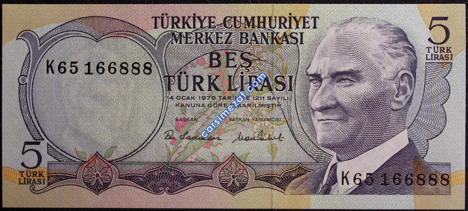 CUMHURİYET KAĞIT 6. EMİSYON 5 LİRA K65 ...888 GÜZEL NUMARA ÇİL