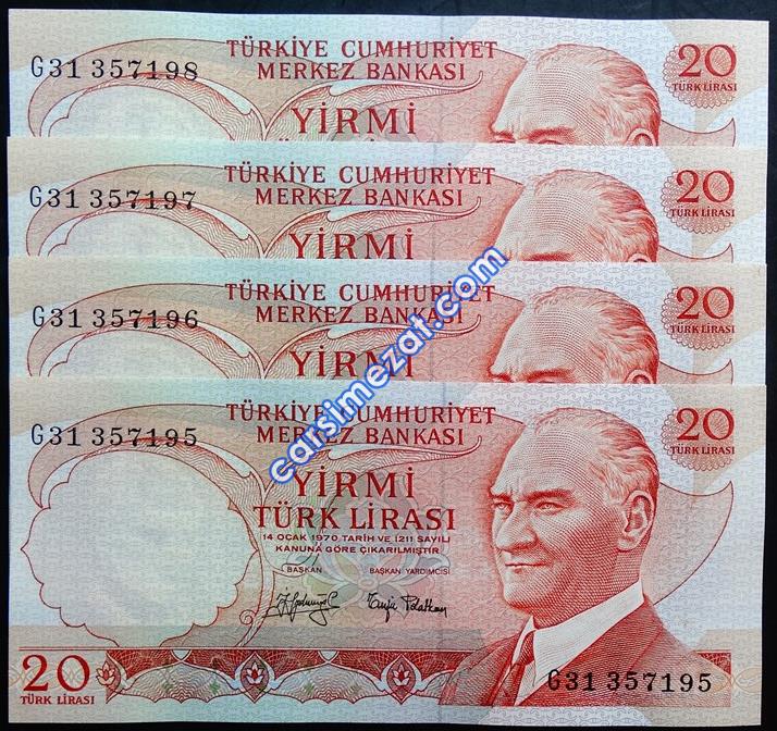 CUMHURİYET KAĞIT 6. EMİSYON 20 LİRA G31 SERİ TAKİPLİ 4 LÜ LOT ÇİL