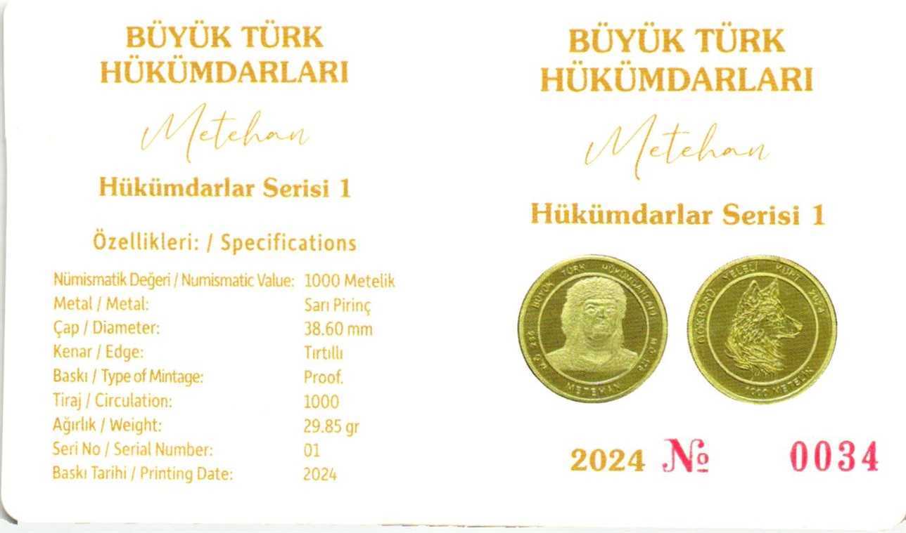 BÜYÜK TÜRK HÜKÜMDARLARI SERİSİ 1 - METEHAN 1.000 METELİK SARI PİRİNÇ SERTİFİKALI ÇİL