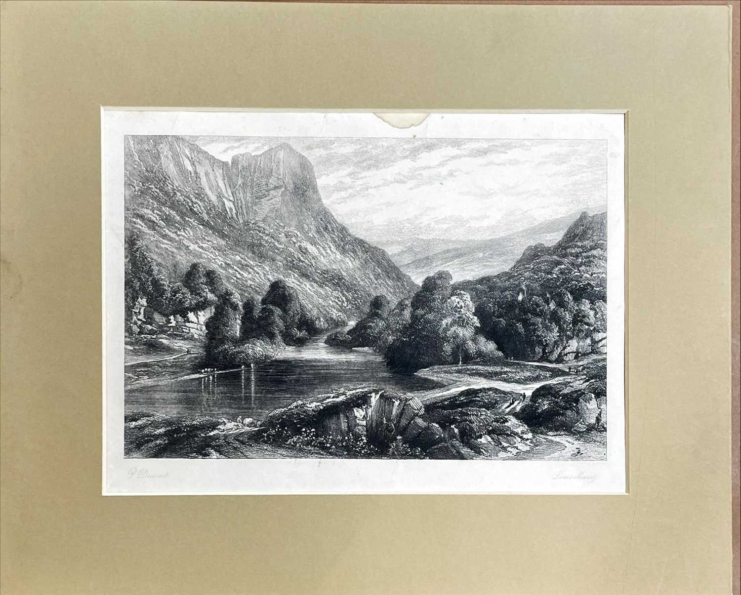 P.Dewint 1850 tarihli dağ Vadisi ve dere manzara gravürü ebat 35x28 paspartulu