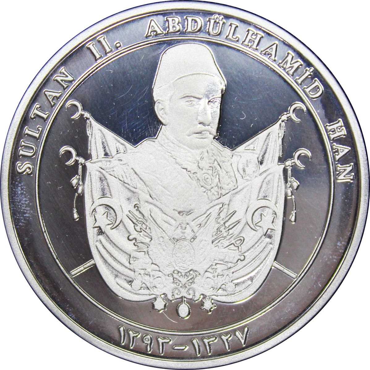 SULTAN II. ABDÜLHAMİD HAN HATIRA MADALYON METAL: ALÜMİNYUM PROOF ÇAP: 60 MM KENAR: DÜZ TİRAJ: 1000 AĞIRLIK: 38 GRAM BASKI TARİHİ:2024 SERTİFİKALI ÇİL